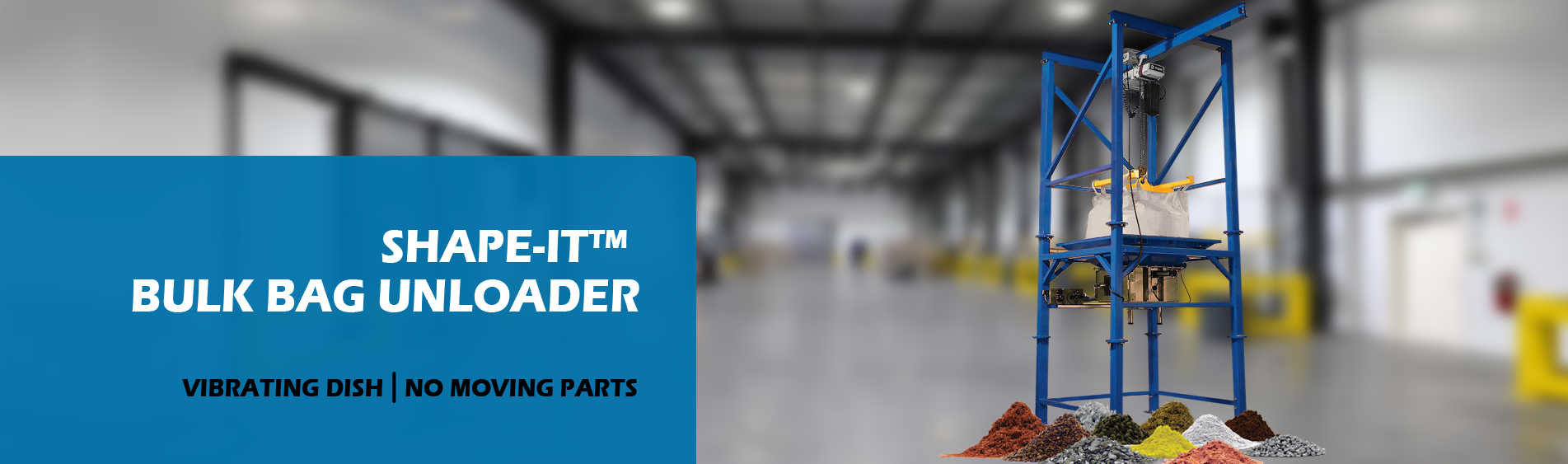 A Shape-It™ Bulk Bag Unloader was provided to properly discharge PVA powder. Material is unloaded into a GeoMate™ Vibratory Feeder, then discharges into a bag dump hopper, which feeds directly into an Aeromechanical Conveyor.